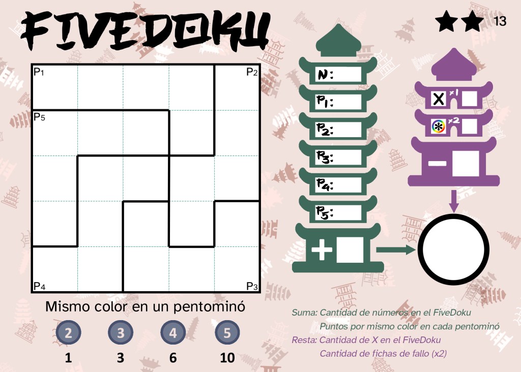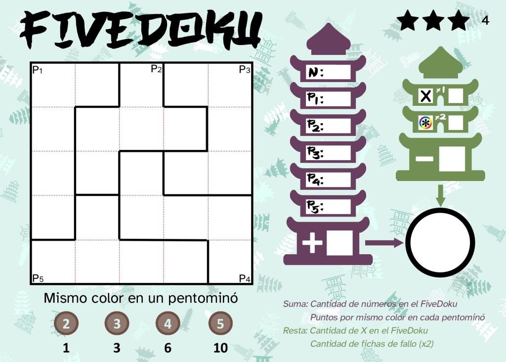 A partir de esta idea, hemos creado FiveDoku, un juego Roll and Write que se basa en la idea de hacer SuDoKus de 5×5. ¿Que aspecto tienen?, pues se trata de recuadros de 5×5 casillas, en las que hay 5 pentominós. Cuando tenemos un recuadro de 5×5, no podemos tener divisiones regulares, como las de 3×3 en los SuDoKus normales. En este caso, las divisiones son irregulares y esto nos genera diferentes formas, aunque las reglas siguen siendo las mismas: poner los números del 1 al 5 en cada fila, en cada columna y en cada pentominó.