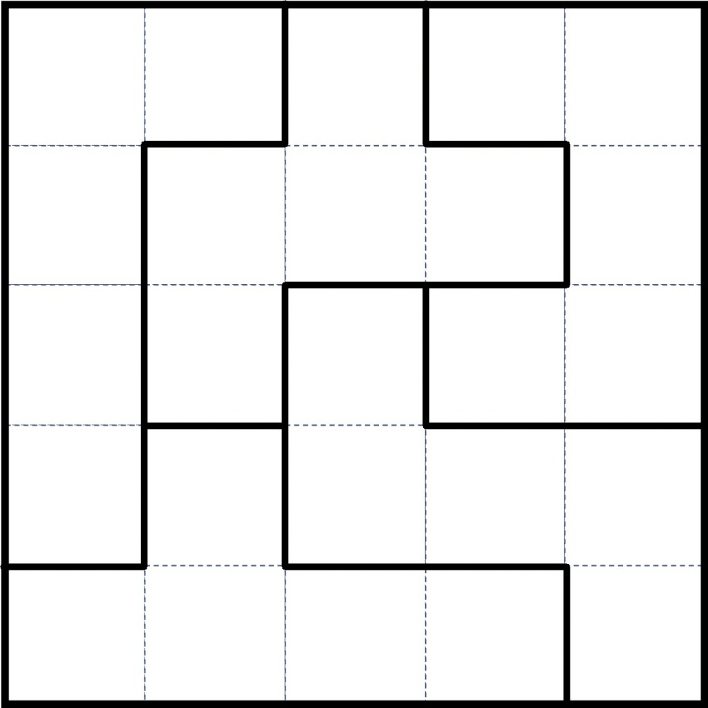 Una de las cosas interesantes de los FiveDokus es que hay 107 distribuciones diferentes de pentominós para formar un cuadrado de 5×5 casillas (sin contar las simetrías ni las rotaciones del cuadrado completo). Eligiendo una u otra distribución tenemos diferente complejidad en el juego. Esto es así porque en algunos casos hay muchas formas posibles de distribuir los números para que se cumplan las reglas, mientras que en otros casos, hay muy pocas. De hecho, hay 4 distribuciones que no tienen solución. Puedes intentar buscar la solución del siguiente FiveDoku, aunque te aseguro que no la vas a encontrar.