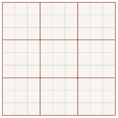 Se juega en un recuadro de 9×9 casillas que, a su vez, está dividido en 9 recuadros de 3×3, como el de la imagen. En las casillas tienes que ir poniendo números del 1 al 9, de manera que no se repitan en cada fila, en cada columna y en cada uno de los 9 recuadros de 3×3.