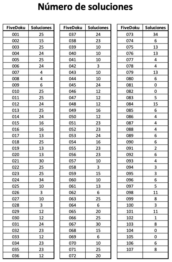 Por último, y por si tienes curiosidad, puedes ver el número de soluciones que tiene cada FiveDoku (los tengo numerados del 1 al 107) y la distribución de soluciones en las tablas siguientes.