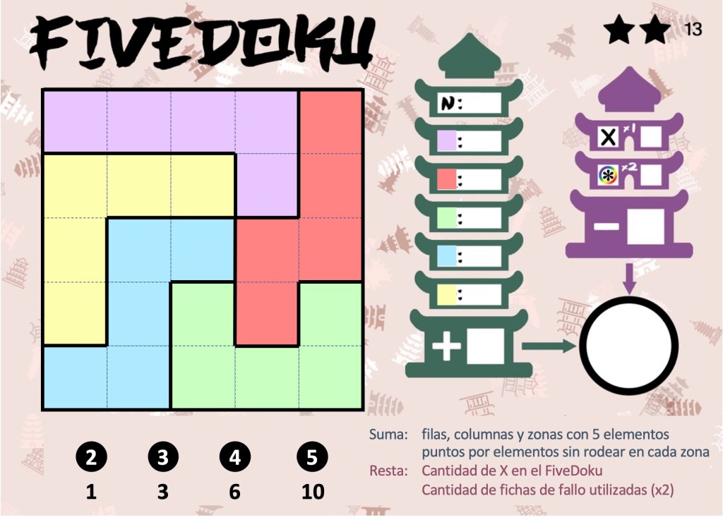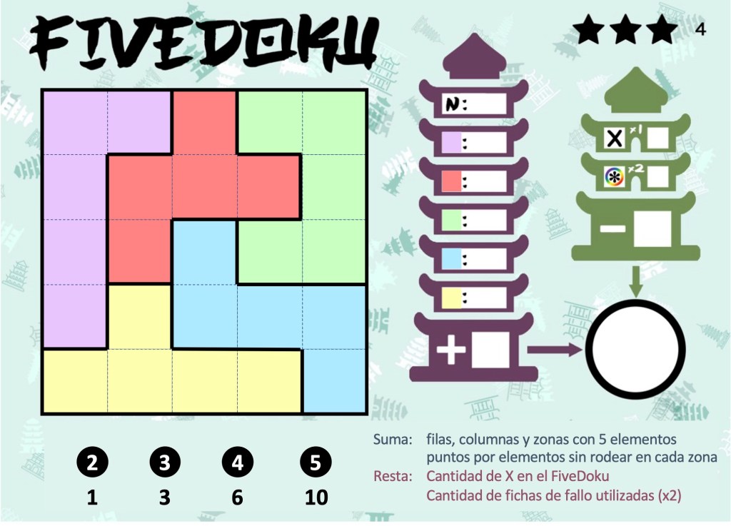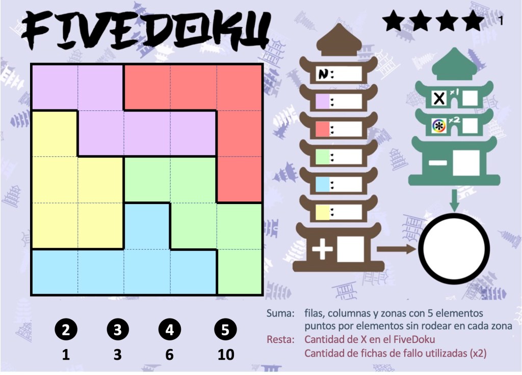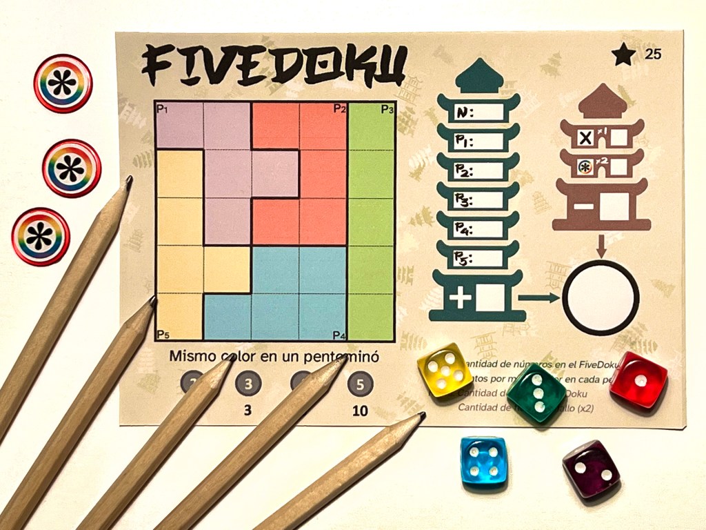 FiveDoku es un juego roll and write en el que irás rellenando un recuadro de 5×5 casillas formado por cinco zonas de diferentes colores. Estas zonas están formadas por 5 casillas conectadas por sus lados. En cada turno se lanzan cinco dados, cada uno de un color, y con los que vayas seleccionando deberás asegurarte de que pones los números del 1 al 5 en cada fila, en cada columna y en cada zona, tratando de poner el número del dado elegido en la zona de su color. Si consigues que en las diferentes zonas haya muchos números de su color, conseguirás más puntos para ganar al final de la partida.