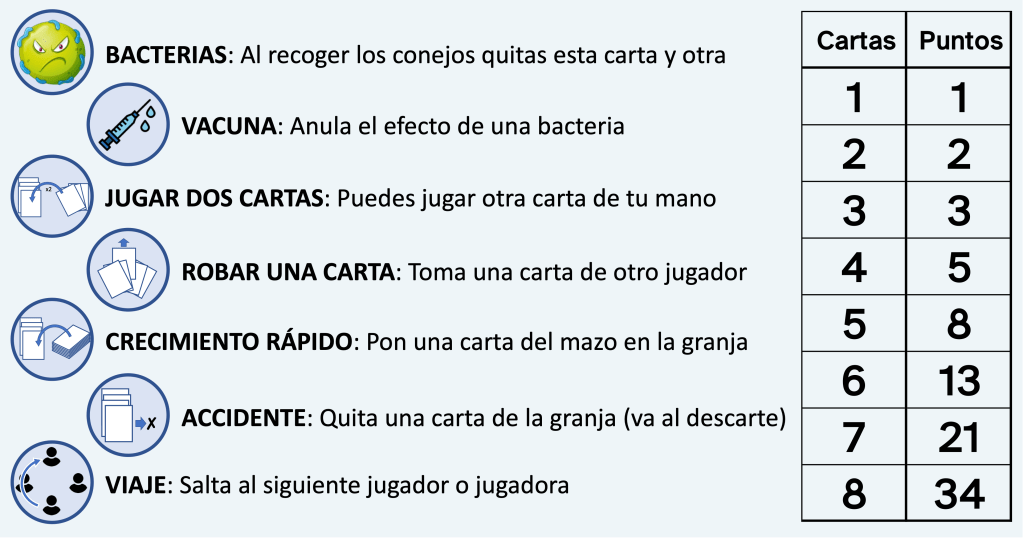 - 54 cartas de generación de conejos: 10 de cada raza de conejos y 4 comodines.