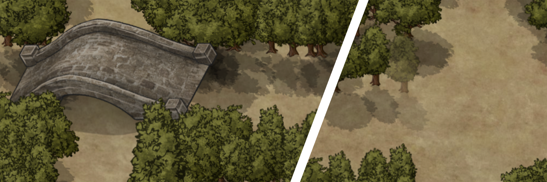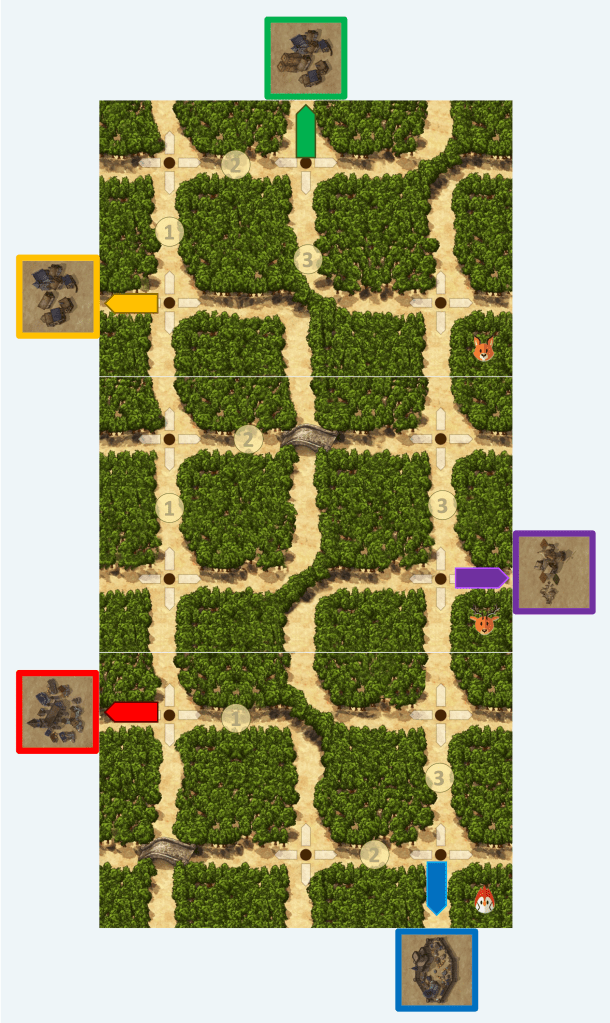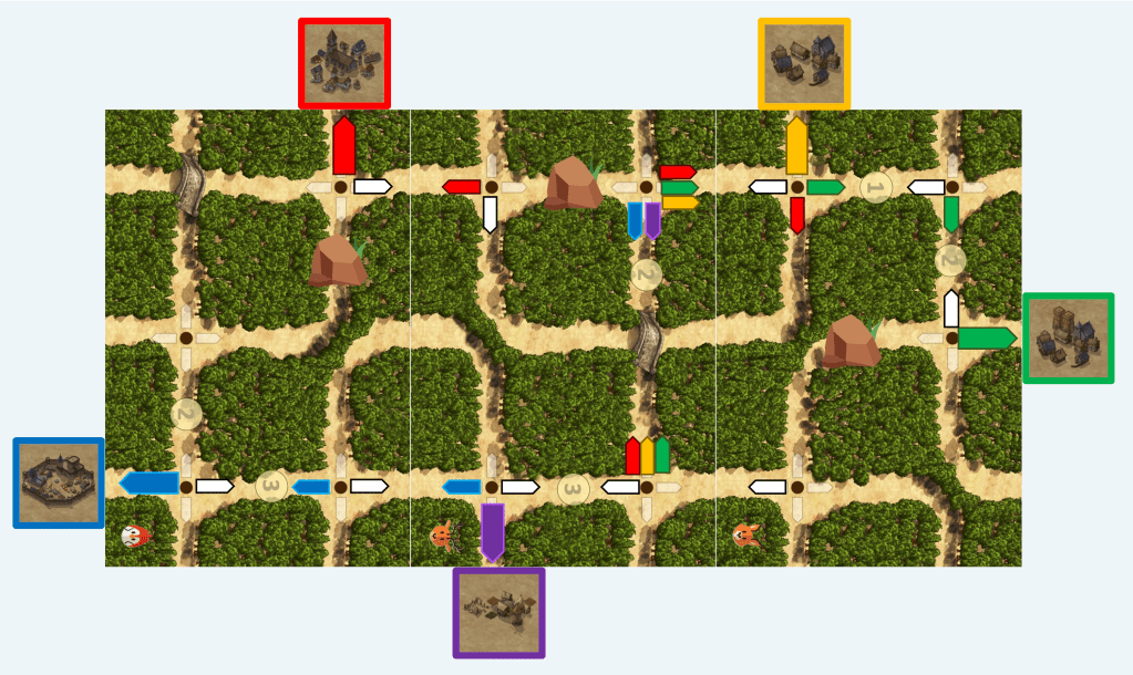 Una vez que hayas formado el bosque, coloca las cinco losetas con las ciudades en diferentes lugares de la parte exterior del bosque, en contacto con un camino de salida. Pon una flecha del color de cada ciudad en el cruce más cercano a ellas. En la figura de ejemplo se muestra un tablero con 3 losetas.