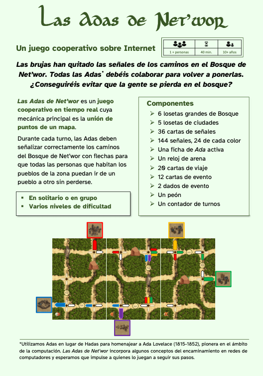 Utilizamos el término Adas en lugar de Hadas haciendo un juego de palabras para homenajear a Ada Lovelace (1815-1852). Ada fue pionera en el ámbito de la computación y se le atribuye el primer programa capaz de ser ejecutado por una máquina. Las Adas de Net’wor incorpora algunos conceptos propios del encaminamiento en redes de computadores y confiamos en que impulse a quienes lo juegan a seguir sus pasos.