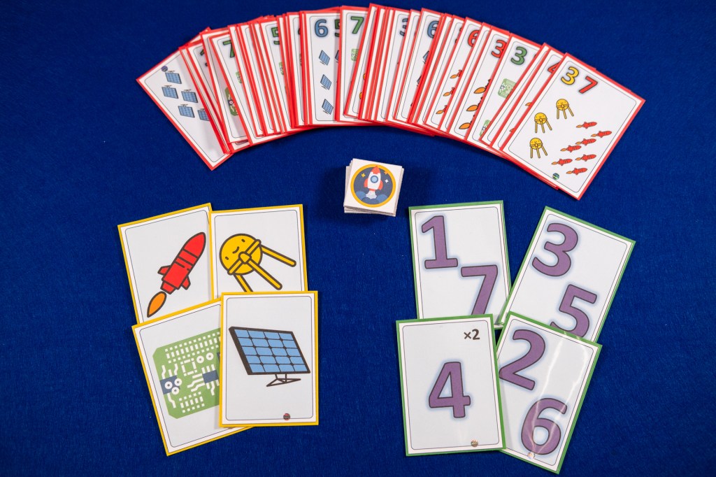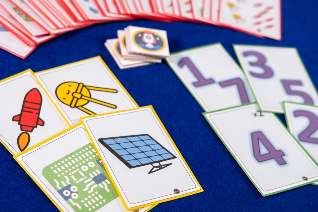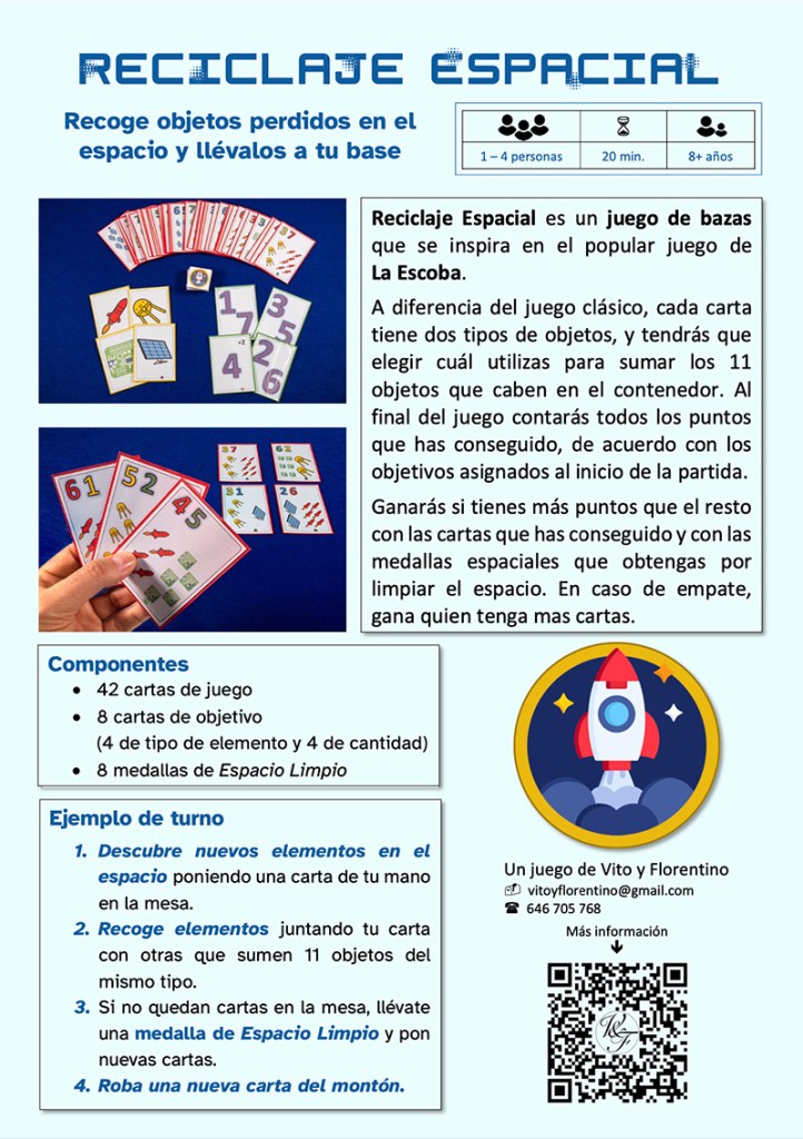 Reciclaje Espacial es un juego de bazas inspirado en el popular juego de “La escoba”, en el que debes intentar llevarte cartas de tu mano y de la mesa a tu montón. Al final del juego contarás todos los puntos que has conseguido, de acuerdo con los objetivos asignados al inicio de la partida. Ganarás si has sumado más puntos que tus contrincantes con las cartas que has conseguido y con las medallas espaciales que obtengas por limpiar el espacio. En caso de empate, gana quien tenga más cartas.