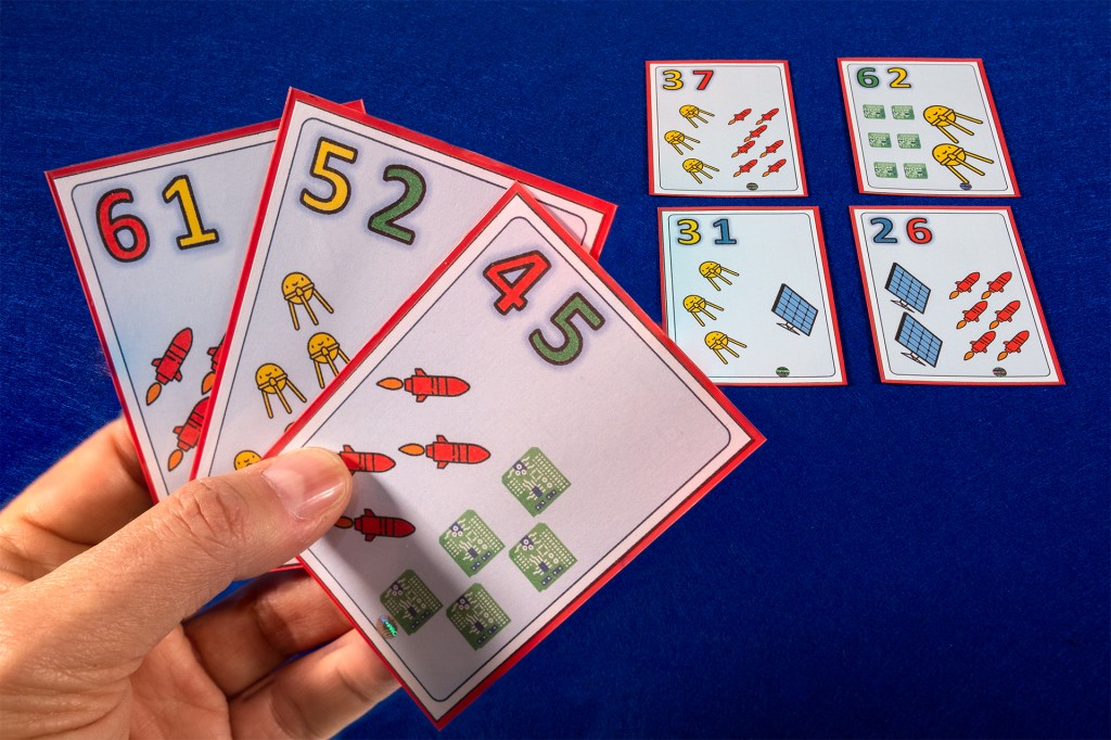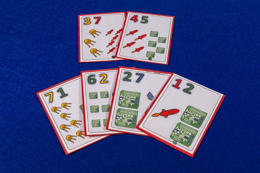 Si juntando la carta que acabas de jugar desde tu mano con otras cartas de la mesa puedes sumar 11 objetos del mismo tipo (p. ej. 11 satélites), toma esas cartas y ponlas boca abajo en tu lado de la mesa formando un montón..